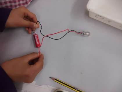 「かん電池のプラス極とマイナス極にどう線をつけると豆電球にあかりがついたよ。」