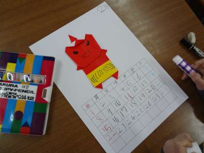 折り紙で鬼の身体と顔を折ってカレンダーの台紙に貼りつけました。細かくて難しかったのですが,みんな頑張って折ることができました。