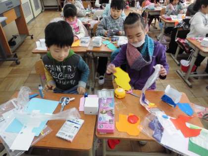 図工の時間に、袋に息を吹き込んで、箱から飛び出すしかけを使って