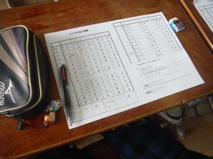 表を見ながら自分の名前をハングルで書き,名刺を作って友だちと交換しました。