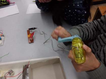 手回し発電機と豆電球や発光ダイオード,オルゴール,モーターなどをつなぎました。