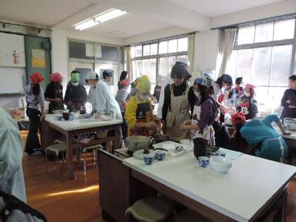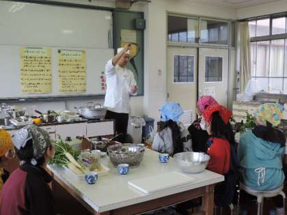 「瓢亭」の高橋義弘さんに、だしについて教えていただき、かつおとこんぶの合わせだしを使った「大根とおあげのおつゆ」「水菜としめじのたいたん」の2品を調理しました。