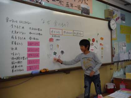 以前,家庭科で学んだ「五大栄養素」と「食べ物の三つの働き」の復習もしました。