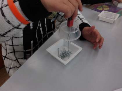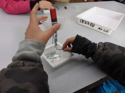 紙や下敷き・プリンカップなどを間にはさみ,磁石が釘やモール,クリップを引きつけるか実験すると・・・
