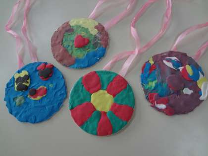 メダルは,色のついた紙ねんどを,自由に,きれいに貼りつけていきました。それぞれ,個性のある素敵なプレゼントができました。
