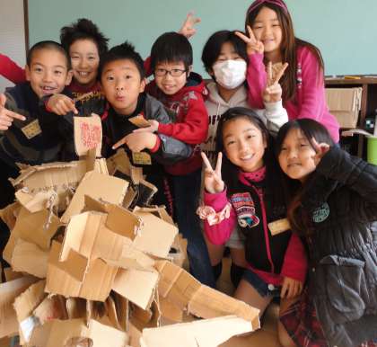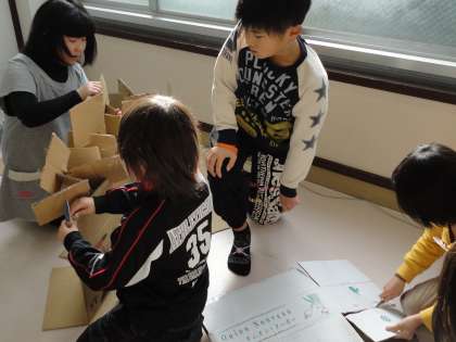 協力して段ボールカッターで切りこみを入れて,組み合わせて…。