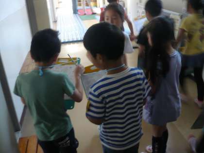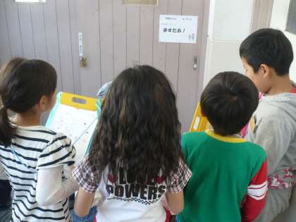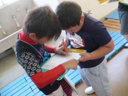 今日は楽しみにしていた学校探検でした。探検バックを肩からさげて,2年生が迎えに来てくれるのを待っていました。2年生のお迎えが来ると,グループに分かれて2年生と手をつないで学校探検に出発しました。どこに何があって,どんなことをするところなのか,誰がどこにいるのかなどを教えてもらいながら,学校中を回りました。来週は同じグル—プで校外学習に出かけます。子どもたちは,頼もしいお兄さん・お姉さんと一緒に校外学習に行けるのますます楽しみにしている様子でした。