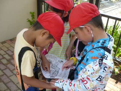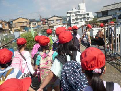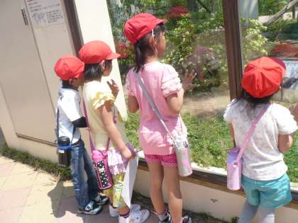 今日は,初めての校外学習に出かけました。行き先は京都市動物園です。2年生のお兄さん・お姉さんと一緒に行き,動物園ではクイズラリーをしました。2年生に手をつないでもらい,いろいろな動物を見て回った子どもたちは,とても楽しそうでした。お昼はお待ちかねのお弁当。嬉しそうにお弁当をほおばっていました。帰り道は子どもたちはくたくたでしたが,自分たちの足で帰ってくることができました。学校に帰ってきた子どもたちは,疲れながらもにこにこ笑顔でした。またこれからも,いろいろな学習や遊びの中で,2年生と関わっていけたらと思います。