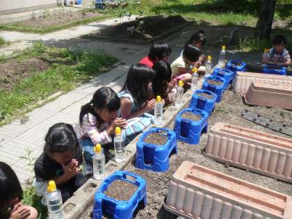 今日は生活科の学習で,あさがおの種を植えました。ひとりひとり植木鉢に土を入れて,種をまきました。元気に大きく育つように願いを込めて,水やりをしました。「どんな花が咲くのかな?」「大きく育つといいな!」など,子どもたちはこれからをとても楽しみにしています。毎日の水やり,がんばるぞ!!