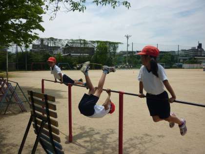 体育で鉄棒運動に取り組んでいます。今できる技の連続にチャレンジしたり,もう少しがんばればできそうな技に挑戦したり,みんなで力を合わせてがんばっています。学習の最後には,上がるわざ・回るわざ・下りるわざを組み合わせて発表します。