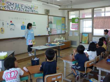 今年度初めての食育の授業がありました。栄養教諭の中野先生から,食べ物の3つの仲間分けを教えていただきました。グループごとに実際に食べ物を赤・黄・緑の3つに分けてみました。「やったあ。大正解!!」「へーそっちなんや!!」と新たに知ったこともたくさんあったようです。
