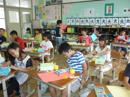 図工では,「ゴムの力でトコトコ」という作品を作りました。動くしくみを作るのに苦戦していましたが,動いた瞬間,「わあーすごーい。」と歓声が上がっていました。その後,思い思いにかざりつけをし,すてきな作品になりました。