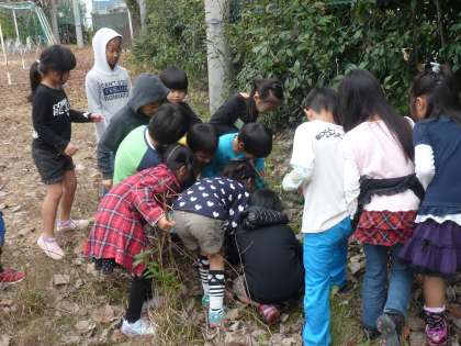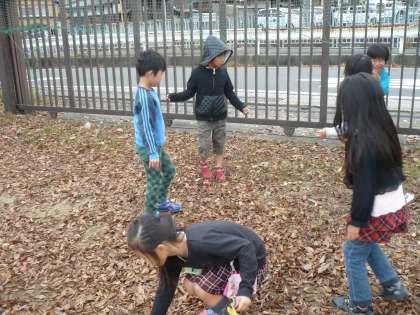 校外学習で秋見つけをしてから,ゲームを考えたり秋のお店をひらいて楽しく遊んだりして,秋を感じてきました。そんな楽しい秋もそろそろ終わりを迎えようとしています。日が沈むのも早くなり,寒さも増してきました。そこで,今日は最後に学校の中の秋を感じて探検をしました。目・耳・鼻・手・心など,いろいろな感じ方ができました。
