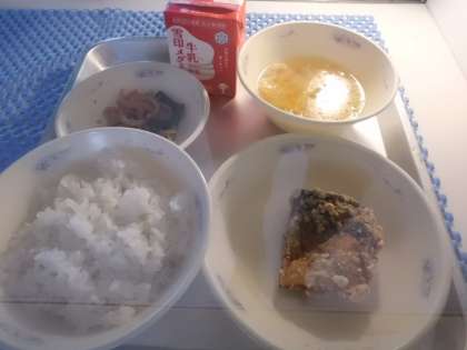 今日の献立は、胚芽米ごはん・牛乳・さばのたつたあげ・やさいのきんぴら・キャベツの吉野汁です。さばのたつたあげの香ばしいにおいが給食室の近くにただよっていました。