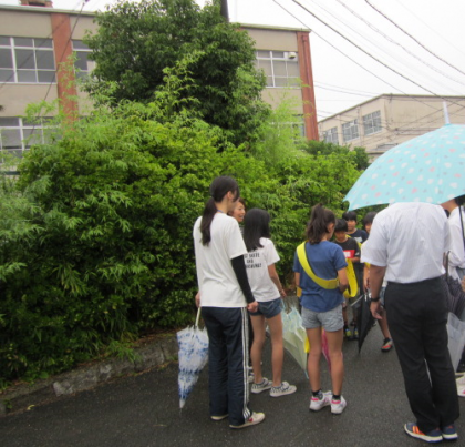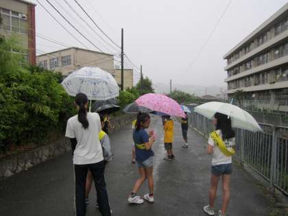 雨の中,春日丘中学校の生徒会のみなさんと先生方が,本校の児童会の子どもたち・教職員と共に,春日野小学校の子どもたちを迎えてくださいました。