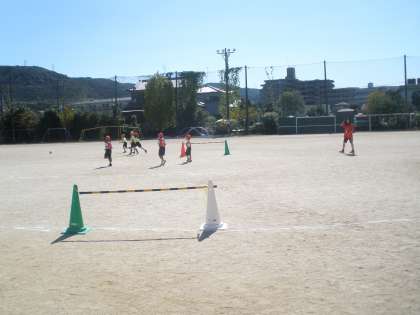 体育ではボールけりゲームをしています。友達にパスをしながら,ゴールに向かって一生懸命ボールをけっています。