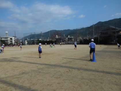 5年生で体育の学習で「キックベースボール」を行いました。ベース型のスポーツに,初めはルールが混乱している様子もありましたが,だんだんとルールも理解し,ゲームを進めていくことができました。遠くに飛ばす方がいいのか,転がす方がいいのかという攻めの作戦や守備ではどこのアウトから取ればいいかなど,いろいろとチームによって作戦を考えていました。学年でも試合をし,楽しく活動することができました。