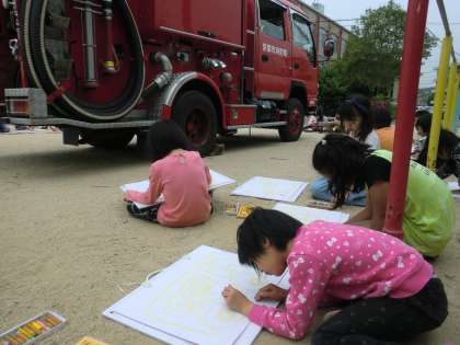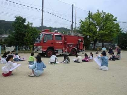 今日は2時間目に第1回避難訓練がありました。「お・は・し・も・て」を意識して,真剣に訓練を行うことができました。その後,消防車を近くで見せていただき,消防の絵を描きました。「タイヤは大きいよ。」「ホースがぐるぐる巻かれているよ。」など,いろいろなことに気づきながら描くことができました。