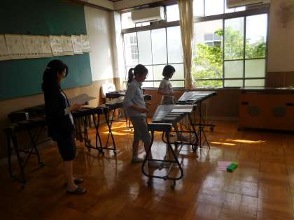 6年生の音楽の学習で,「ラバーズコンチェルト」という曲の合奏をしています。それぞれのパートにあった楽器を考え,練習をしています。音を聞きながら「主旋律があまり聞こえないので,もう少し人数を増やしてみよう!」「この旋律には鉄琴が合うんじゃないかな?」など,相談して練習を進めています。これからの合奏が楽しみです。