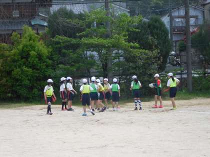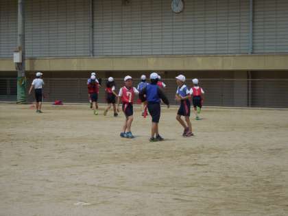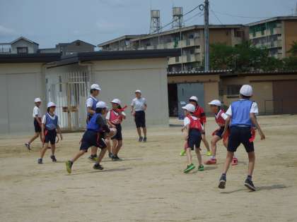 6年生の体育の学習で「タグラグビー」の学習をしています。ルールをみんなで確認し合いながら練習や試合を行っています。タグラグビー部に入っている児童が多く,1つ1つを丁寧に教え合っている姿がとても素敵です。自分の後ろにボールをパスしていくことに慣れない子どもたちも,練習や試合を重ねることで徐々に上達してきました。今後の試合も楽しみです。