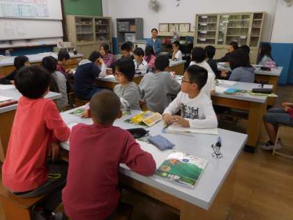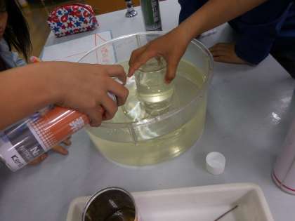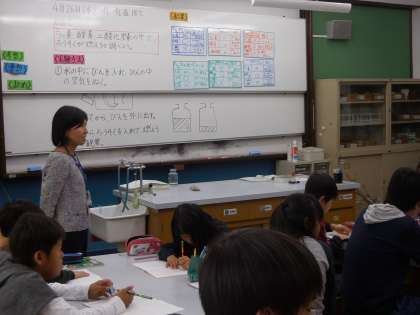 理科で「ものの燃え方」の学習をしています。この日は,水上置換法で,酸素・窒素・二酸化炭素を集めて実験をしました。うまく気体を集められている班や苦戦している班もありました。集めた気体の中に,火を入れると…炎が燃え上がったり,「ポンッ」と火が消えたりして,それぞれの性質によってものの燃え方がわかることが実験で分かりました。火の扱いには十分注意して,今後も実験を進めたいと思います。