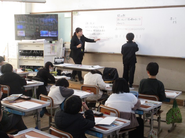 算数の時間に「間の数」の単元の学習をしました。どこの間に入るのか考える際に、図に書いて表すと考えやすいことが分かりました