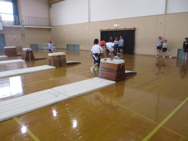 5年生の体育の時間では、「跳び箱運動」を学習しています。自分にあった跳び箱の技や段の高さを選んで、めあてをもってそれぞれ頑張っています。その都度自分のめあてが達成しているかタブレットで確認しながら学習をすすめられています。