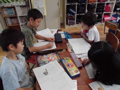 わたしたちの小学校は,東がわに山があります。北には,だん地が多くて,南には,田畑が多いです。また,北には公園が多くて南には少ないです。北にも南にも店が少ないです。道は,せまい所やひろい所があります。南には,竹やぶが多くて東には,山が多いです。校区には,いろいろな場所があることに気づきました。