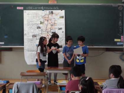 わたしたちの小学校は,自ぜんや家にかこまれています。学校から見て北がわには,だんちが多く,横断歩道やしんごうがとても少ないです。お店も少ないです。南がわには,田畑が多く,北がわにくらべると家が多いです。南がわは,お店が何けんかあります。北がわと南がわはいろいろなちがいがあり,新しい発見がありました。
