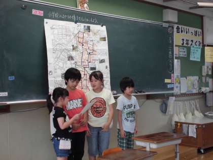 わたしたちのすむ日野のまちをしょうかいします。わたしたちの小学校は,北にも南にも田んぼや畑が多いです。北がわには,だんちが多いです。南がわには,公園が多いです。東がわには,山がたくさんあり,竹やぶもあります。北にも南にもしんごうきが少ないです。南がわにはびょういんが一けんしかありません。校区には,いろいろな場所があることに気がつきました。