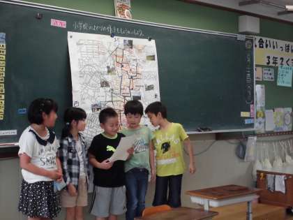 わたしたちの日野のまちをしょうかいします。わたしたちの小学校は,自ぜんがいっぱいあります。学校の前には,田んぼがあります。東がわには,竹やぶや山が多いです。公園や家もいっぱいあります。北がわには,だん地が多いです。南がわには,山科教習所やなごみの里んびょういんがあります。校区内に,ほいく園が3けんあります。