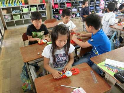理科で「電池のはたらき」の学習をしています。今回は,どうすればモーターがもっと速く動くのかについて考えました。電池を増やせばいいのではないか,という意見が出たので調べることにしました。電池の繋ぎ方には,直列つなぎと並列つなぎがあるということを学習し,電池2つで実験をしました。直列つなぎでやってみると,モーターのあまりの速さにびっくりしていました。今度は豆電球の明かりがどうなるのかも調べようと思います。
