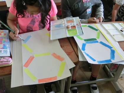 図工の時間にビー玉を転がしてゴールを目指す,コロコロガーレを作っています。はじめは土台の紙に,絵の具で好きな色や模様を付けていきました。4段のコロコロガーレを作るので,1段ずつ色や模様を変えて工夫しながら塗っていました。