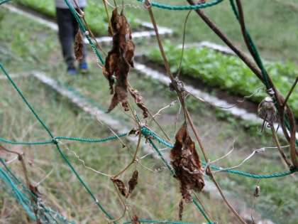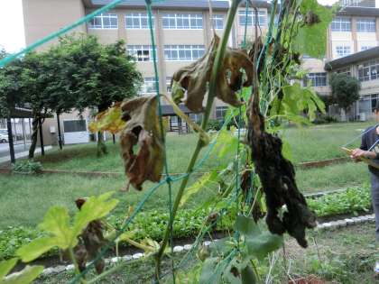季節と生き物(秋)の学習で,春から育てているツルレイシを観察しました。予想では,葉が茶色くなってパリパリしていると思う,花はもう無くなっているだろう,くきはまだ緑色のままだと思う,などの意見が出てきました。実際に観察しに行くと,葉は茶色でパリパリしているものと,黄緑色で周りが茶色くなってきている葉がありました。くきは細くなっていて,花は見られませんでした。秋になり,夏に比べて気温が下がってくると,植物はだんだん枯れてくるということが分かりました。
