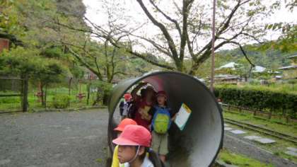 蹴上で電車を降り,第三トンネルを確認した後,インクラインや水道管の大きさを体感しました。その後,田辺朔郎像を見てどんなことをした人なのか学習し,像の周りでお弁当を食べました。途中で雨がパラパラと降ってきましたが,みんなおいしそうに食べていました。