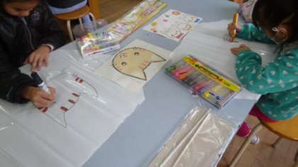 『理科工作 たこ』では,凧作りをしています。自分が好きな絵や,写真を見ながら世界に一つだけの凧を作っています。完成した自分の凧が空に舞うのを楽しみに,頑張って作成しています。