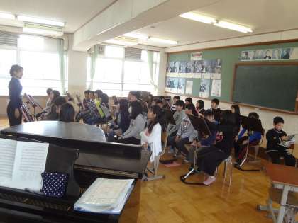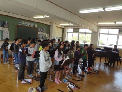 音楽の学習は,胡井(えびい)先生に教えていただきます。おなかのたいそうの歌を歌ったり,リコーダーの音の出し方の確認をしたりしました。