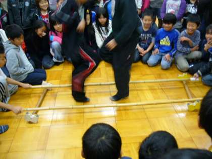フィリピンから留学で京都大学に来ておられるジョージ・プリマベーラさんにいろいろ教えていただきました。3年生の子ども達は,ティ二クリン(日本ではバンブーダンスとよばれていますが)に大はしゃぎでした。