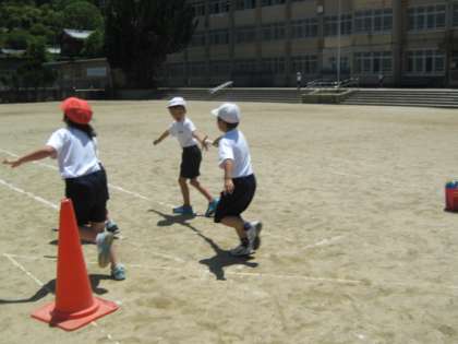3年生の体育では,今,リレーをしています。チームでタイムを計って,記録を伸ばすことをめあてにしています。まだ,始めたばかりですが,少しずつバトンの渡し方,受け取り方や,リードの仕方を覚えて活動しています。