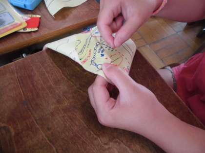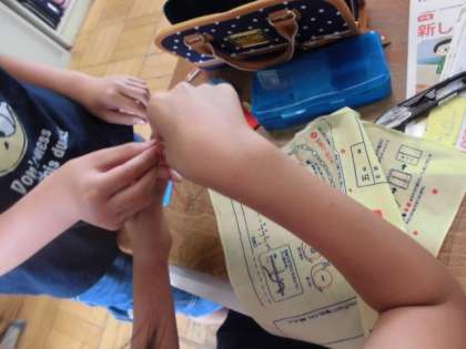 玉結びと玉止めの練習です。友だちに教えてもらったり,手伝ってもらったりして,だんだん上手になってきました。