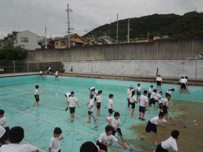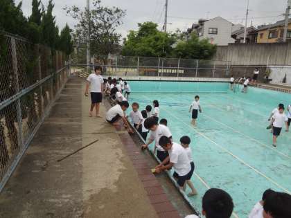 いよいよプールの学習が始まります。学校の代表として,5年生がプールの掃除をしました。1年間の汚れがたまったプールは,とても汚くて…。みんなはじめは戸惑っていましたが,一生懸命そうじして,プールはピカピカになりました。