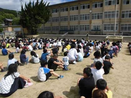 町別児童会の教室にいったん集まり,待機(保護者引き渡し)児童は体育館へ,集団下校する児童は運動場に移動しました。