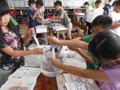 理科の学習で,筒の中に水をとじこめて,手応えと体積を確かめました。