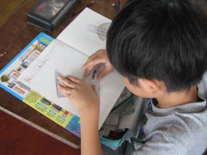 平行の意味を確認しながら,三角定規や分度器を使って丁寧に作図しています。