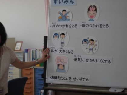 今月のお話は,大切な「すいみん」についてです。柴原先生から,すいみんのはたらきや,必要なすいみん時間についても指導していただきました。