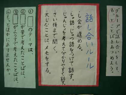自分で決めたテーマについて音や様子を表す言葉を集めていたのですが,班で話し合うことでもっとたくさんの言葉を出し合って言葉を広げることができました。