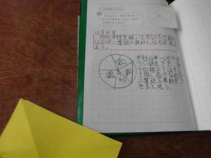 ひとりひとり手元の紙を使って・・・。円の性質を使って・・・。いろいろ考えています。