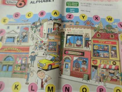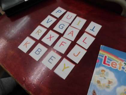 並べたカードから,レオ先生が示したカードをすばやく見つけ,発音します。なかなか本格的な発音です。