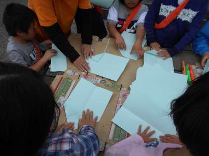 昼食後,紙飛行機をつくりました。少年補導の方に教えてもらいながらつくりました。それぞれが思い思いの工夫を凝らしてつくりました。