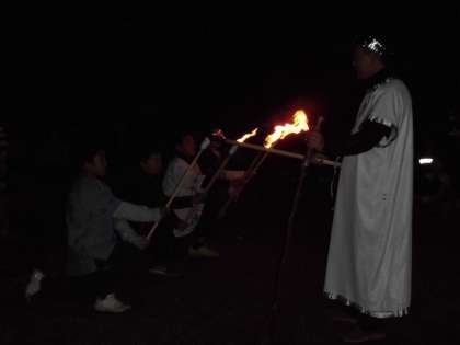 この日のために山から現れた火の神が,火の子たちに火を渡します。